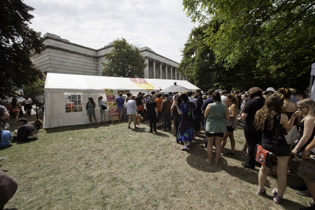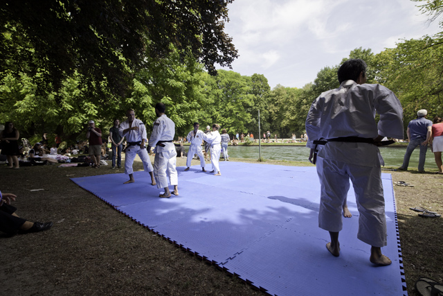 Bei herrlichem, heißen Sommerwetter fand heute das 19. Japanfest im Englischen Garten in München statt. Bereits ab 12 Uhr schoben sich die Menschenmassen hinter dem Haus der Kunst am südlichen Ende des Englischen Garten durch die Wege, um die verschiedenen Attraktionen zu besuchen. Die längste Schlange bildete sich wie jedes Jahr an der Essenausgabe, welche von der Restaurantkette Shoya betrieben wird: