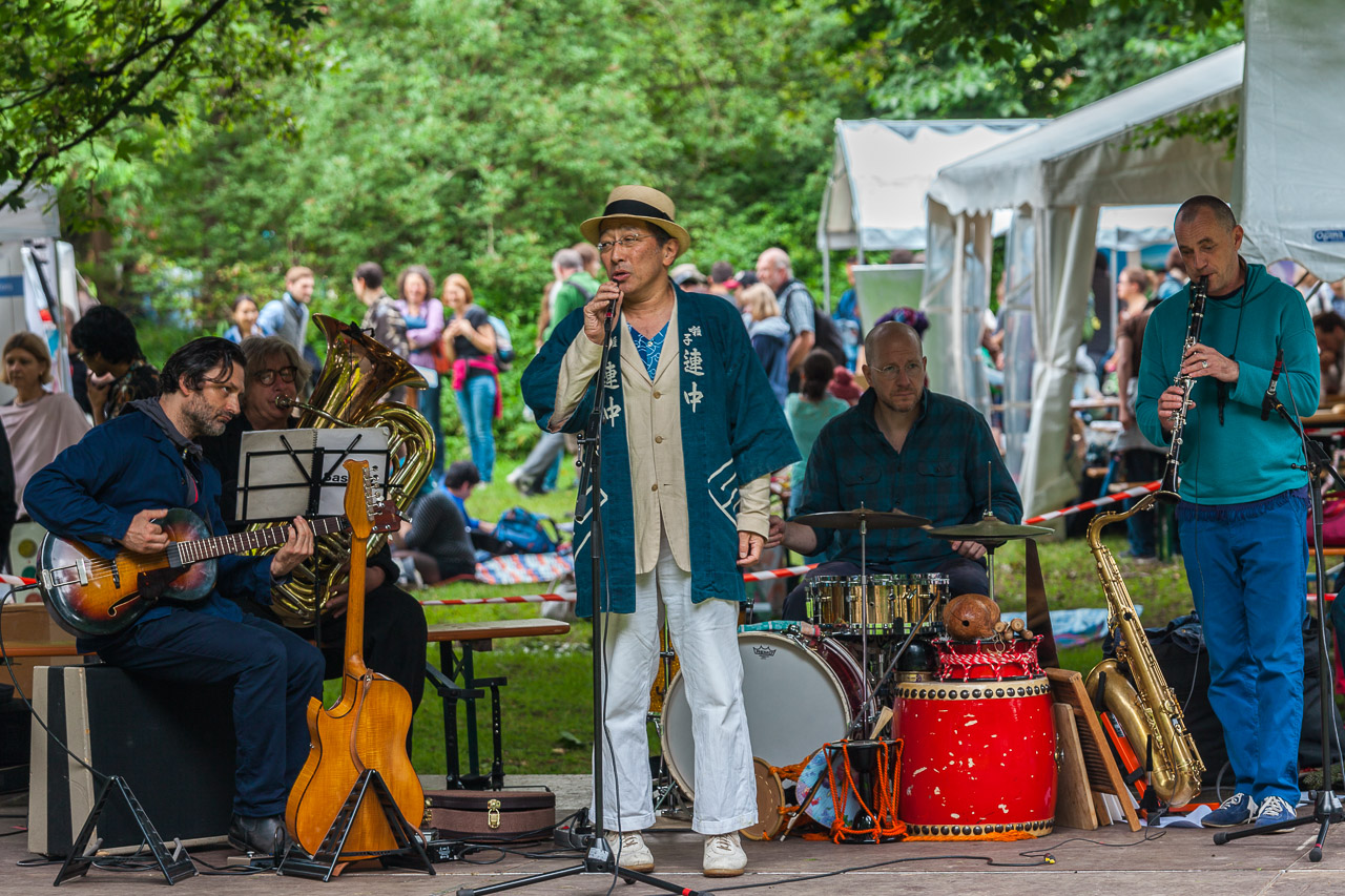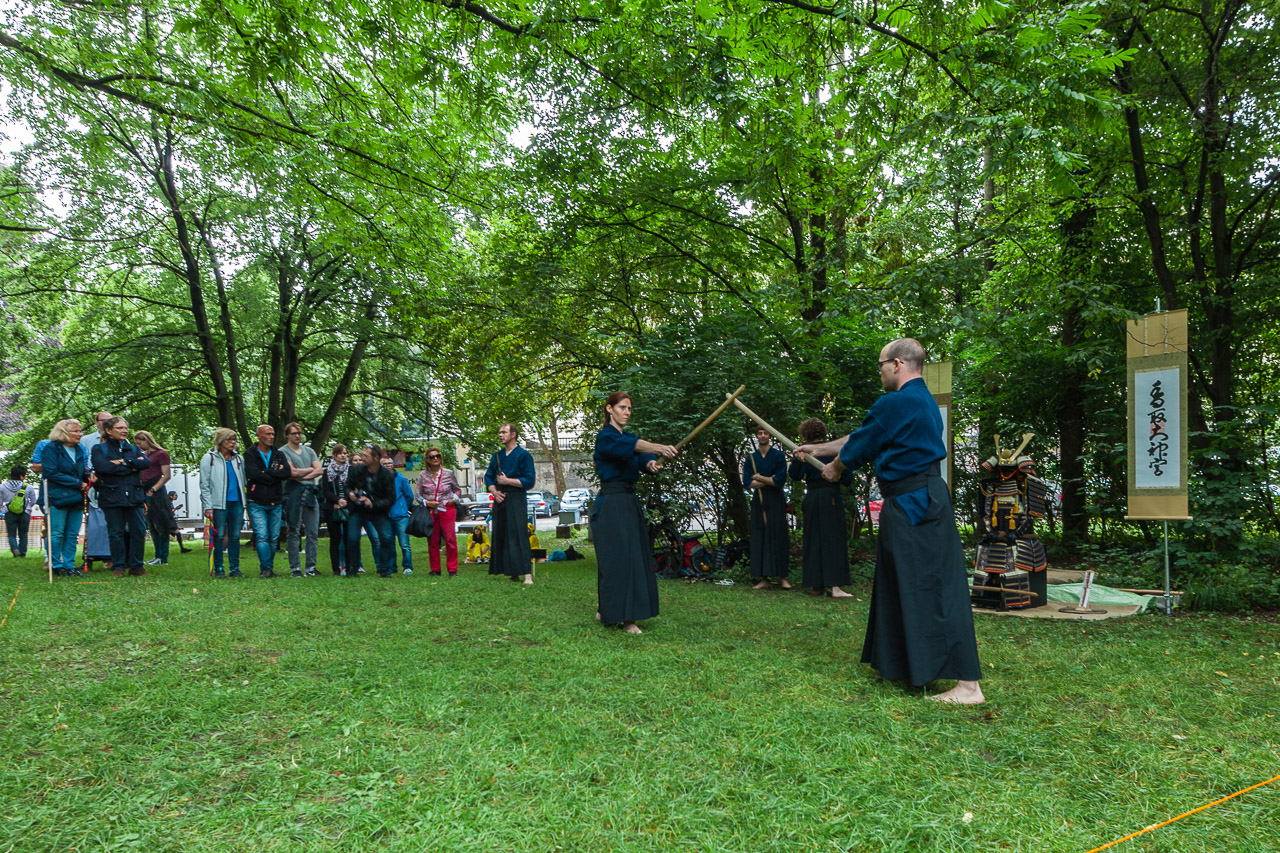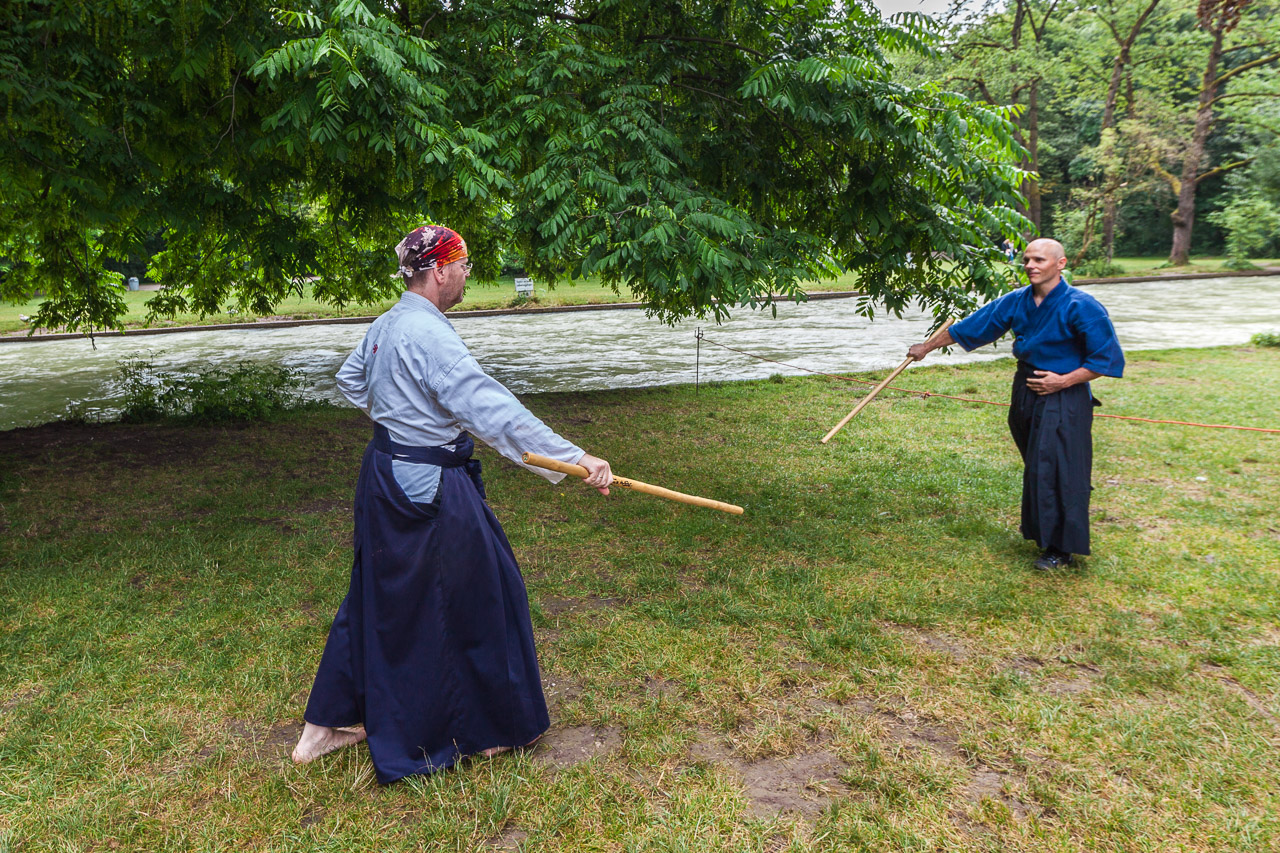Heute fand bei vorwiegend bewölktem Himmel das 21. Japanfest im Englischen Garten in München statt. Nach etwas Regenschauer am Morgen kamen ab 11 Uhr die Besucher zum südlichen Ende des Englischen Gartens, um die verschiedenen Attraktionen zu besuchen. Nachdem es in diesem Jahr etwas mehr Stände mit Kulinarischem aus Japan gab, war es an den Essensausgaben glücklicherweise etwas entspannter als in den Vorjahren, doch war das meiste bereits wieder am Nachmittag ausverkauft. Neben den zahlreichen Highlights auf der Showbühne war eine sehr große Bandbreite der unterschiedlichsten Kampfkünste mit eindrucksvollen Vorführungen vertreten. Am engen Weg um das japanische Teehaus konnten die Besucher wieder eine sehr abwechslungsreiche Ikebana-Ausstellung bewundern. Am Nachmittag begeisterte die eigens aus Japan angereiste Tsuchie Kodomo-Kagura Truppe mit zwei Vorführungen und auch der Shakuhachi-Spieler Seimo Yamaguchi gab ein 30-minütiges Solokonzert.
