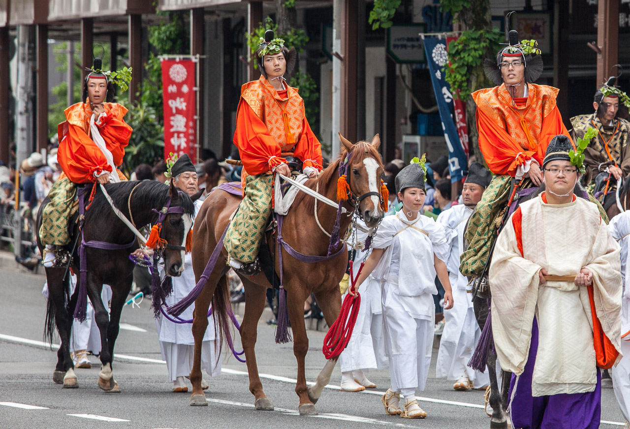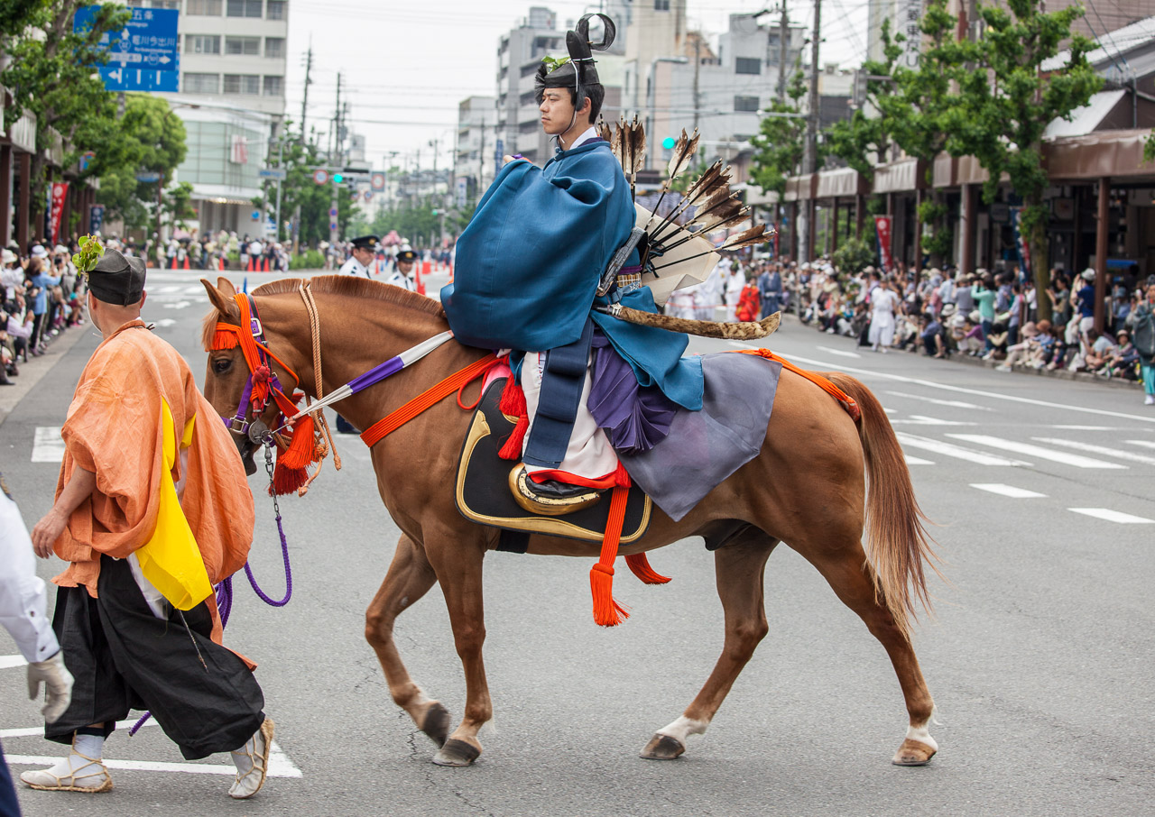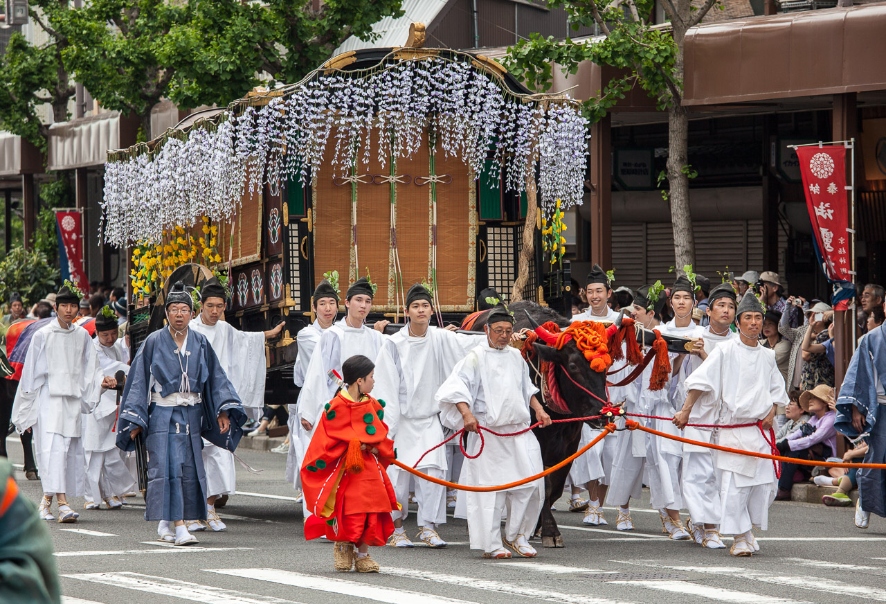 In diesem Jahr war ich Mitte Mai in Kyoto und konnte glücklicherweise eine gute Fotoposition während des Aoi Matsuri ergattern. Bei dieser Parade nehmen circa 500 Personen teil, die im Stil der Heian-Zeit (794-1185) gekleidet sind. Dabei gibt es auch einige berittene Samurai und hohe Geistliche. Schwere Wagen werden bei diesem Umzug übrigens nicht von Pferden, sondern von Ochsen gezogen. In der Geschichte Japans war es nur Samurai vorbehalten, auf Pferden zu reiten. Bauern hatten zur Bestellung ihrer Felder als Zugtiere üblicherweise Ochsen verwendet. Wer sich mehr für die Geschichte und das Fleischverbot zur Edo-Zeit interessiert, den empfehlen ich meinen Artikel in der Huffington Post “Ein Kobe-Rind aus Japan erzählt aus seinem Leben”.