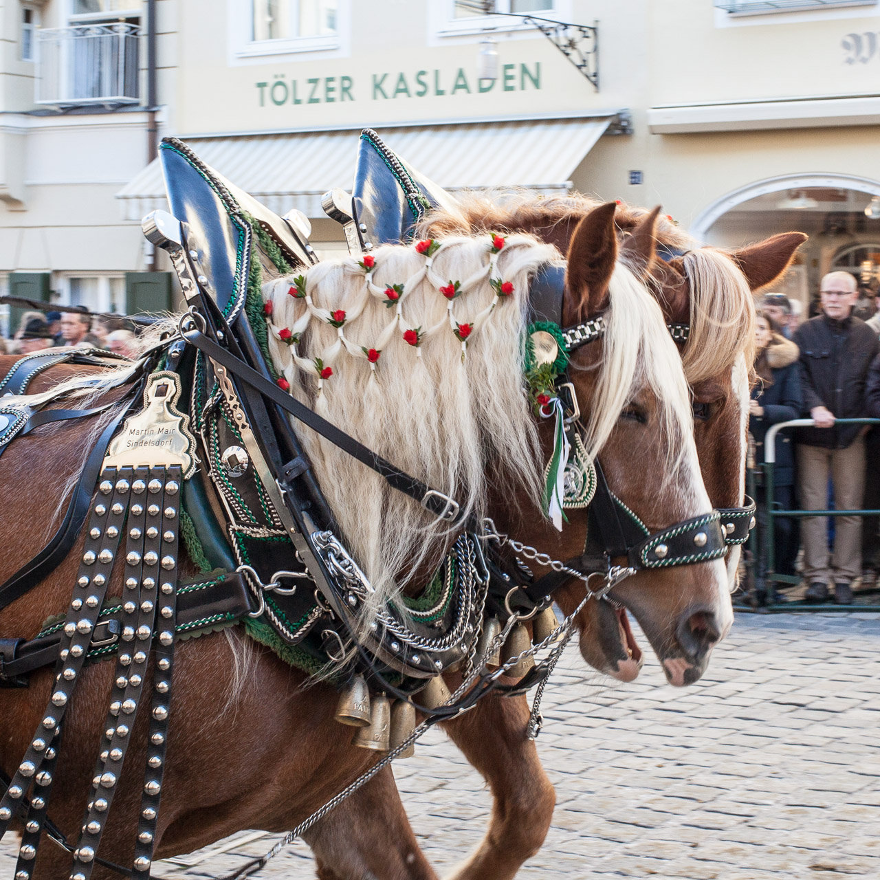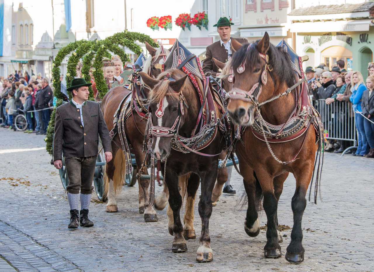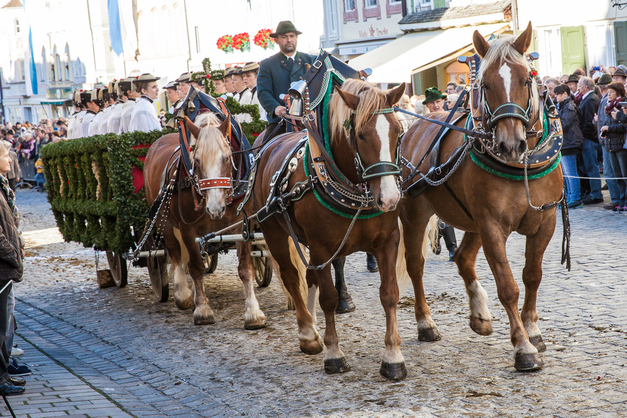 Bei der Leonhardifahrt bzw. dem Leonhardiritt handelt es sich um einen Prozession mit Pferden, ein altes Brauchtum in Bayern. Es findet in Bad Tölz, aber auch anderen Orten zu Ehren des heiligen Leonhard von Limoges meistens am 6. November statt. Leonhard ist der Schutzpatron landwirtschaftlich genutzter Tiere (heute vor allem Pferde), die bei der Wallfahrt gesegnet werden. Die Pferde spielten als Last- und Arbeitstiere für die ländliche Bevölkerung früher eine wesentliche Rolle. Beim Umzug in Bad Tölz nehmen neben einzelnen Reitern ungefähr 80 Vierergespanne teil, die besetzte Truhenwagen ziehen. In diesem Jahr fand die 160. Leonhardifahrt statt und ich bin am Morgen bereits um 7 Uhr mit der Bayrischen Oberlandbahn von München nach Bad Tölz gefahren, um ein paar schöne Fotos zu machen.