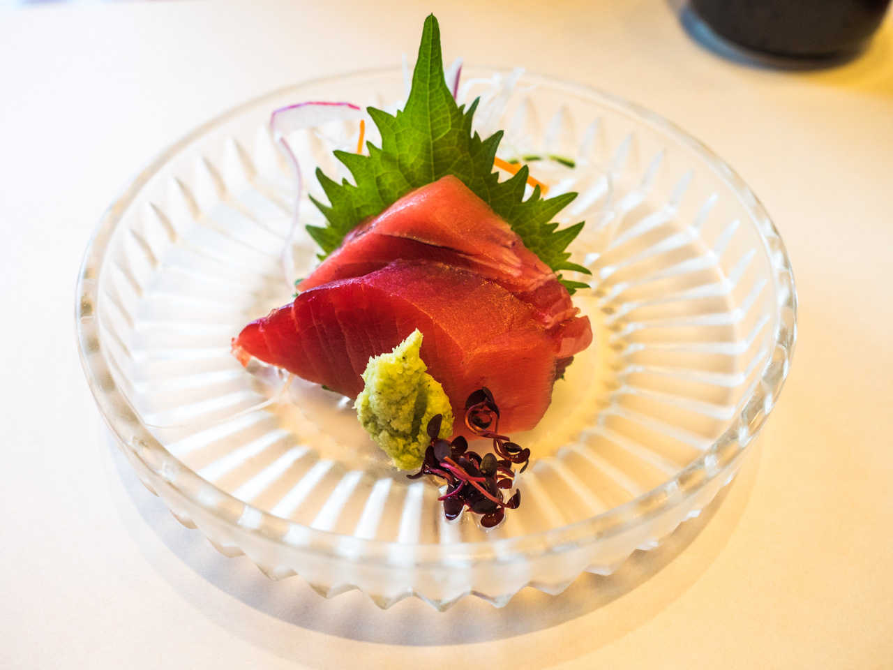 Wir beginnen mit Sashimi, leicht aber nicht unangenehm zäh.