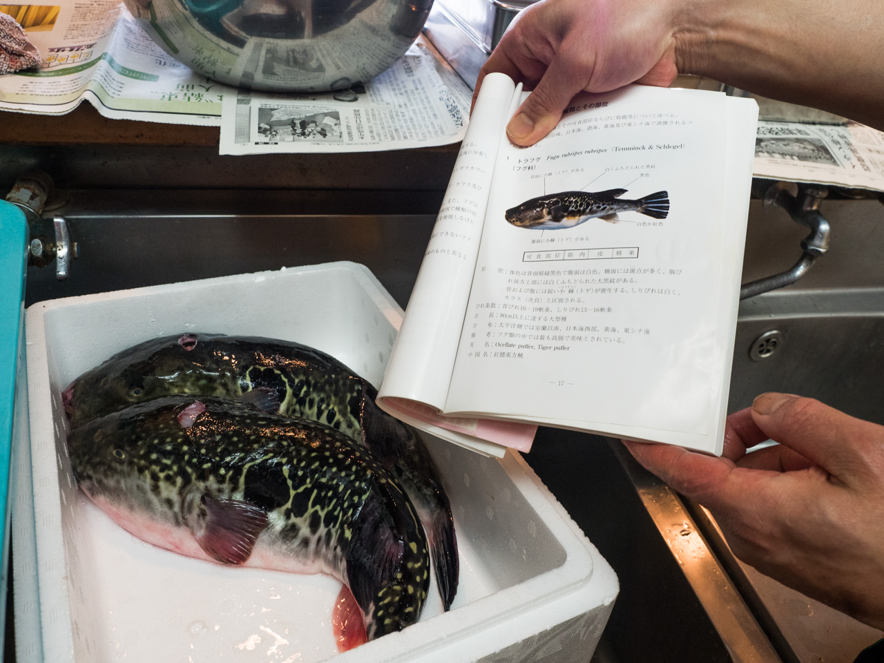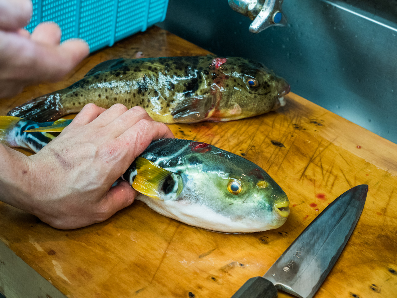 In Japan angekommen lerne ich dann zum einen, dass April, Mai keine Fugu Saison ist. Und zum anderen, dass der Fisch nicht direkt nach dem Zerlegen zubereitet werden darf. Ich buche also unser Menu. Und hoffe, dass in einem Zeitfenster von wenigen Tagen auch ein frischer Kugelfisch auf dem lokalen Markt angeboten wird, dessen Zerteilung ich dann fotografisch dokumentieren darf.