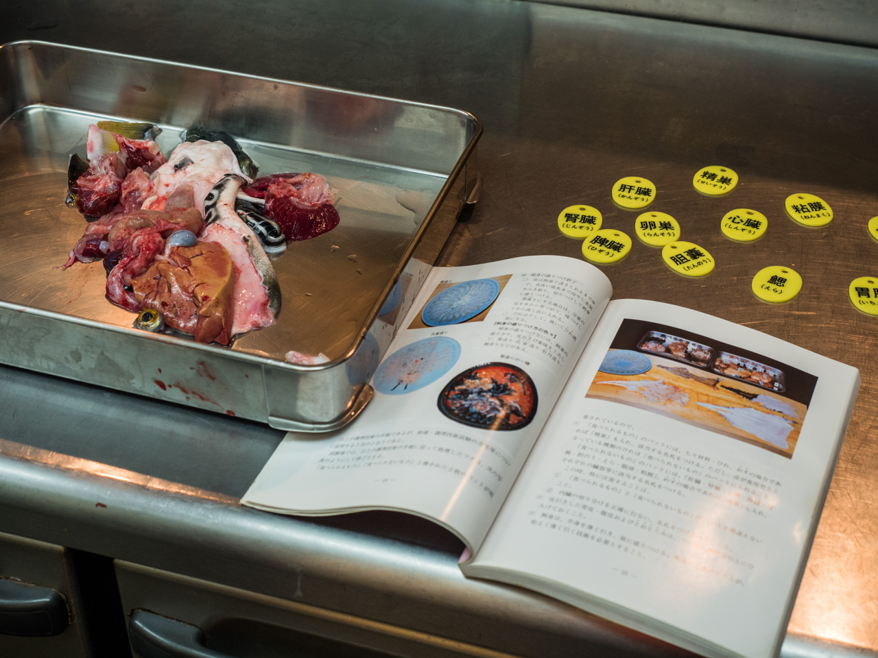 Zack Zack ein paar schnelle Bewegungen mit dem scharfen Messer und schon liegt der erste Kugelfisch komplett enthäutet und zerlegt vor uns. In einer Schale die giftigen Innereien, in einer anderen Schale die genießbaren Filetstücke. Unterstützt durch ein Wörterbuch lerne ich nun mehr über die bereits erwähnte Ausbildung und Prüfung sowie die giftigen Teile.
