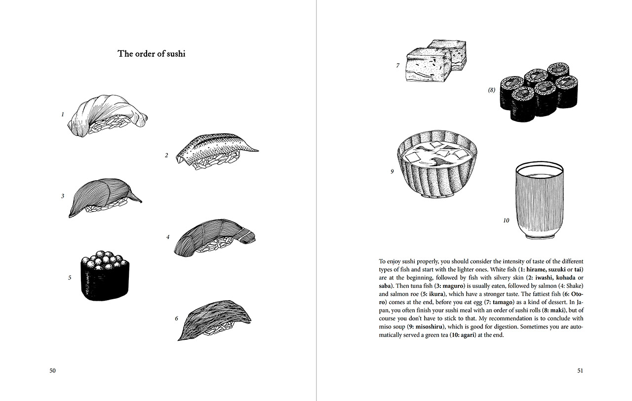 My book „Sushi Guide“, first published in 2016, is available in English since 11st August 2021. The long title of the book is: „Sushi Guide: Picture guide, etiquette manual and dictionary for lovers of Japanese cuisine“. The book contains 32 colour photos and 54 illustrations, which were painstakingly drawn by Theresa Fischer.